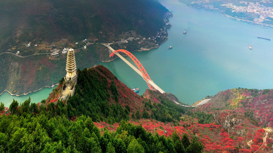 鏡頭前一座座大橋拔地而起;江上一艘艘貨輪竄梭而過;一艘艘從遠(yuǎn)方來的郵輪上乘滿各地游客;秋天的長江兩岸紅葉漫爛;晨霧中城市的列車穿云破霧,美輪美奐,壯觀的立橋猶如音符在跳動(dòng)。