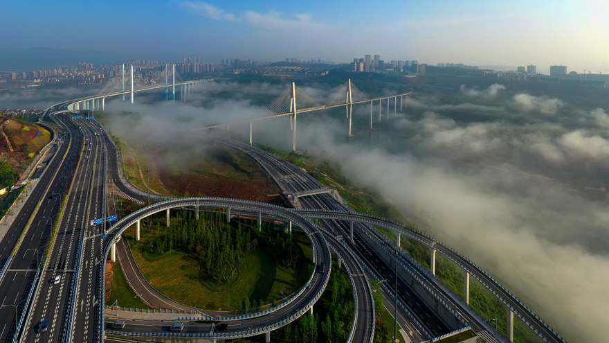 鏡頭前一座座大橋拔地而起;江上一艘艘貨輪竄梭而過;一艘艘從遠(yuǎn)方來的郵輪上乘滿各地游客;秋天的長江兩岸紅葉漫爛;晨霧中城市的列車穿云破霧,美輪美奐,壯觀的立橋猶如音符在跳動(dòng)。