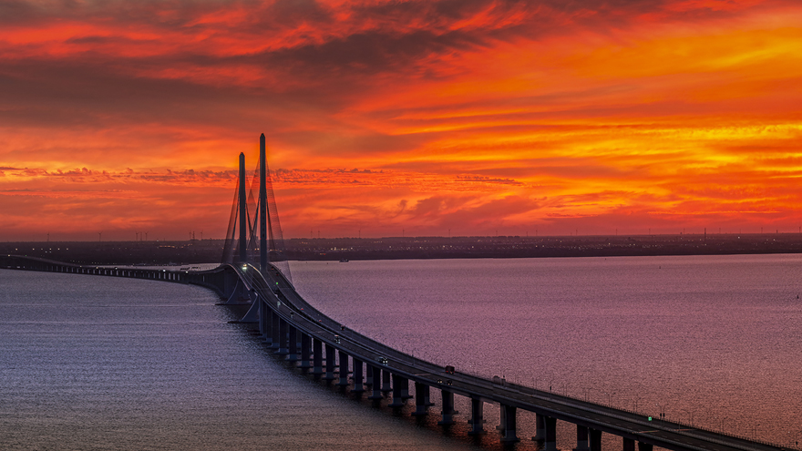 晨曦中,上海長江大橋如蛟龍騰空,在赤紅云潮中劃出鋼鐵弧線。車輛燈光似鱗片閃爍,江面倒映天際熔金,展現(xiàn)自然造化與大國工匠的交響。作為長三角一體化核心通道,日均12萬輛次車流在此匯聚鋼索如時代經(jīng)緯拉起發(fā)展脊梁,定格中國最活躍經(jīng)濟(jì)帶的晨曦律動,詮釋影動長江主題下自然與文明共生的壯美詩篇。