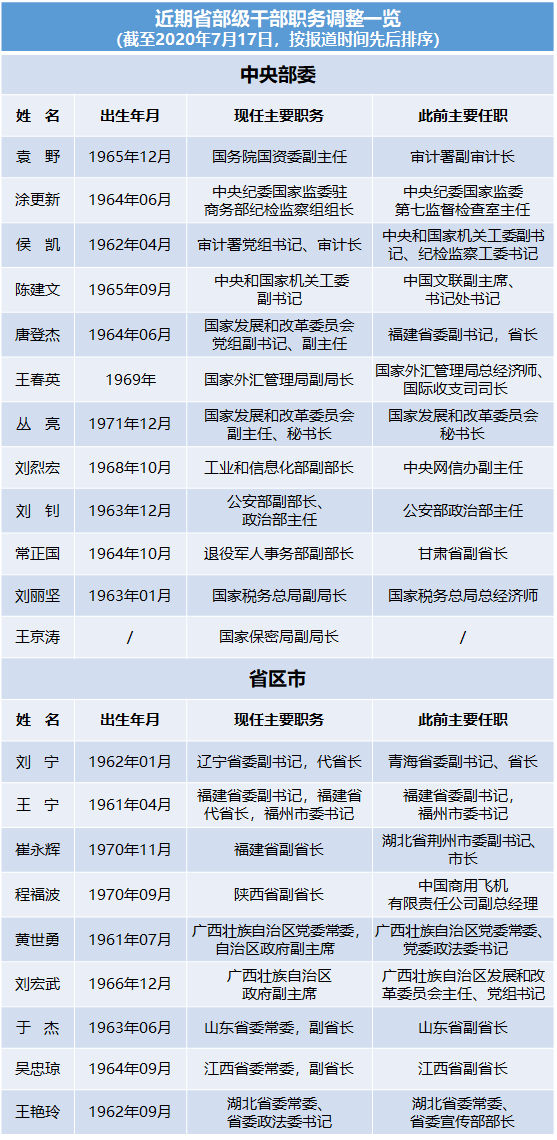 中國共產(chǎn)黨新聞網(wǎng)北京7月17日電 (扶婧穎)近日,國家發(fā)展和改革委員會網(wǎng)站“委領(lǐng)導(dǎo)”欄目更新,顯示唐登杰已任國家發(fā)展和改革委員會副主任。據(jù)統(tǒng)計(jì),半個(gè)多月以來,已有至少20名省部級干部職務(wù)調(diào)整,范圍涵蓋至少11家中央部委及7個(gè)省區(qū)市(具體名單詳見下表)。