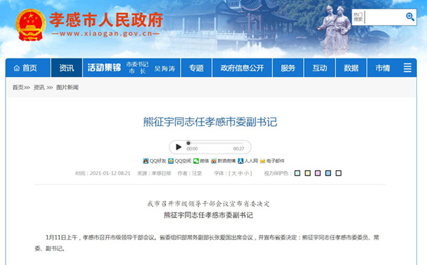 孝感市人民政府網站截圖