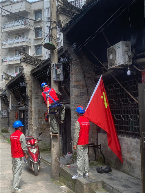 如今,走在勝利老街,青石路面,褐色瓦房,朱門門畫,方格木窗,勾挑檐角,金鳳樓等建筑在古樸中透著紅色的印記。沿街電桿和線路整齊,布局合理,為用戶提供了安全可靠的電源保障。