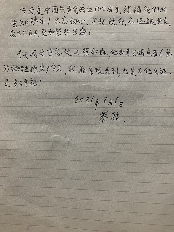 “今天是中國共產黨成立100周年,祝福我們的黨生日快樂。”蔡轉激動地在紙上寫下了這段話:“不忘初心,牢記使命,永遠跟黨走,愿下個百年,更加繁榮昌盛!”