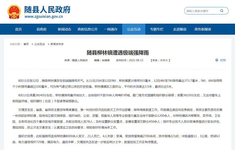 湖北隨縣柳林鎮(zhèn)遭遇極端強降雨 救援搶險工作正有序推進