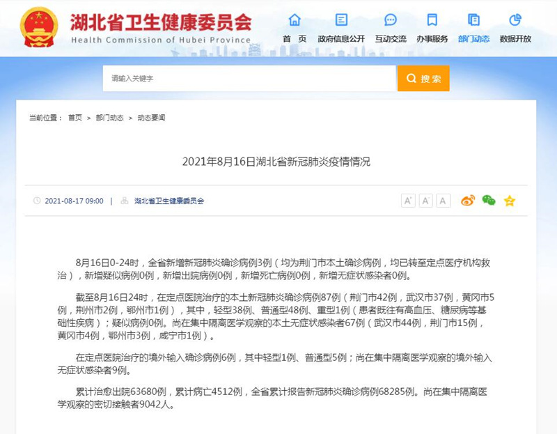 截至8月16日24時(shí),在定點(diǎn)醫(yī)院治療的本土新冠肺炎確診病例87例(荊門(mén)市42例,武漢市37例,黃岡市5例,荊州市2例,鄂州市1例),其中,輕型38例、普通型48例、重型1例(患者既往有高血壓、糖尿病等基礎(chǔ)性疾病);疑似病例0例。尚在集中隔離醫(yī)學(xué)觀察的本土無(wú)癥狀感染者67例(武漢市44例,荊門(mén)市15例,黃岡市4例,鄂州市3例,咸寧市1例)。