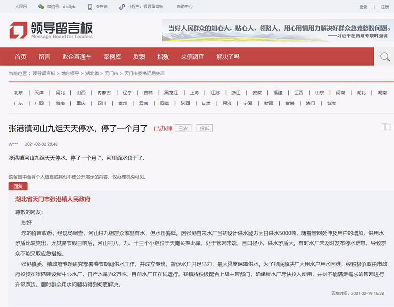 針對(duì)上文中天門市張港鎮(zhèn)停水問題,2月2日,就有網(wǎng)友留言:“張港鎮(zhèn)河山九組天天停水,停了一個(gè)月了!