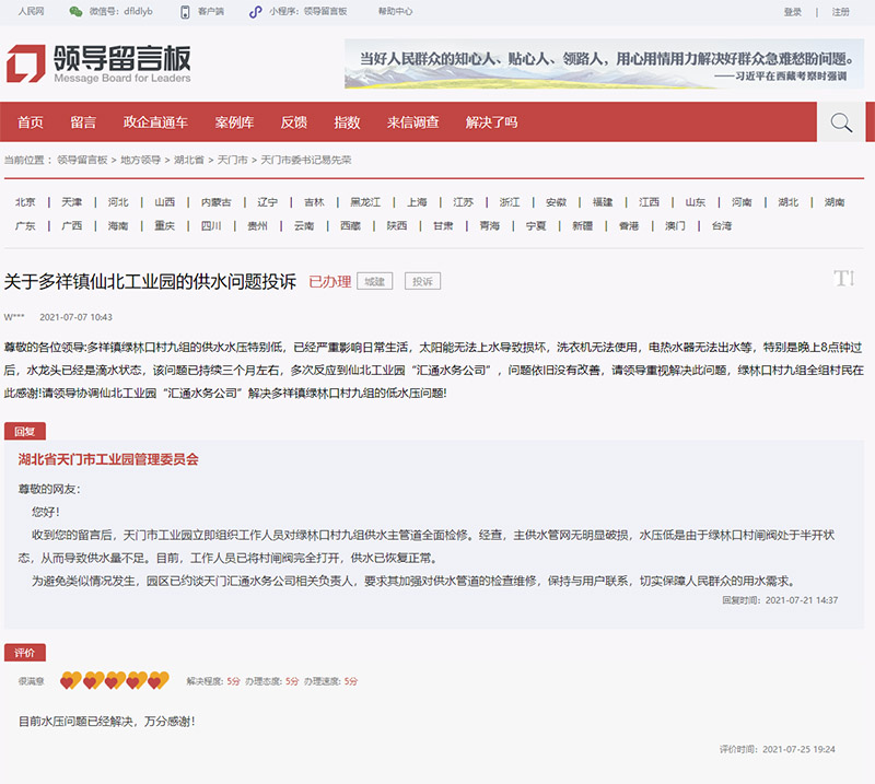 7月25日,湖北省天門市工業(yè)園管理委員會(huì)回復(fù)稱:“經(jīng)查,主供水管網(wǎng)無(wú)明顯破損,水壓低是由于綠林口村閘閥處于半開狀態(tài),從而導(dǎo)致供水量不足。目前,工作人員已將村閘閥完全打開,供水已恢復(fù)正常!睂(duì)于此條回復(fù),網(wǎng)友評(píng)價(jià):“水壓?jiǎn)栴}已經(jīng)解決!