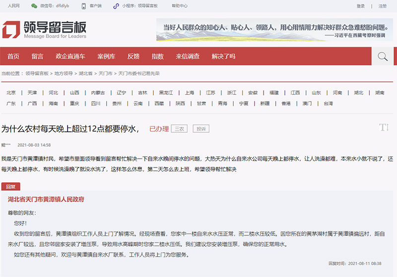 8月3日,網(wǎng)友留言:“我是天門市黃潭鎮(zhèn)村民,為什么自來(lái)水公司每天晚上都停水。”