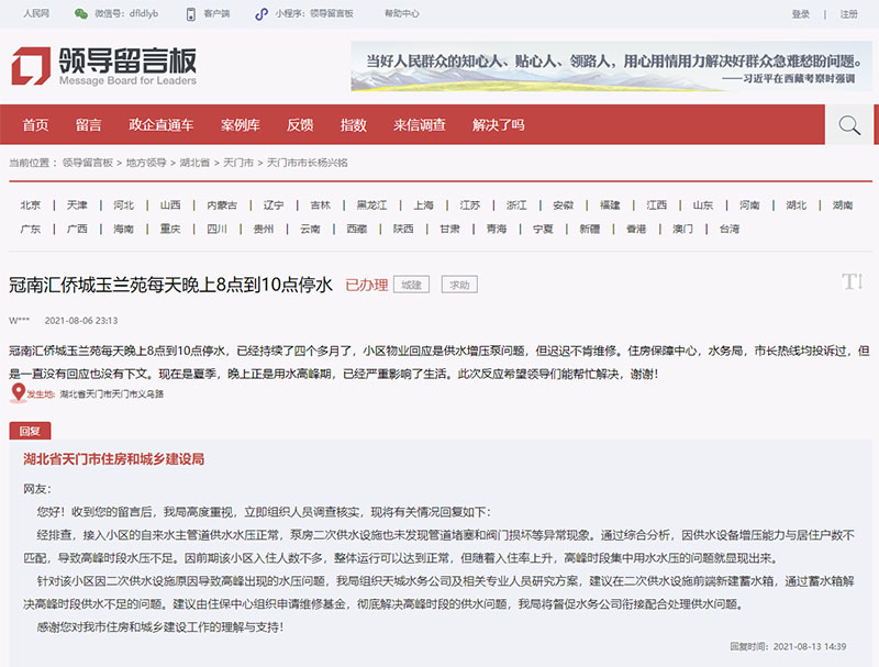 8月13日,湖北省天門市住房和城鄉(xiāng)建設(shè)局回復(fù)稱:“ 通過綜合分析,因供水設(shè)備增壓能力與居住戶數(shù)不匹配,導(dǎo)致高峰時(shí)段水壓不足。因前期該小區(qū)入住人數(shù)不多,整體運(yùn)行可以達(dá)到正常,但隨著入住率上升,高峰時(shí)段集中用水水壓的問題就顯現(xiàn)出來(lái)。針對(duì)水壓?jiǎn)栴},將組織天城水務(wù)公司及相關(guān)專業(yè)人員研究方案,通過蓄水箱解決高峰時(shí)段供水不足的問題。建議由住保中心組織申請(qǐng)維修基金,徹底解決高峰時(shí)段的供水問題!