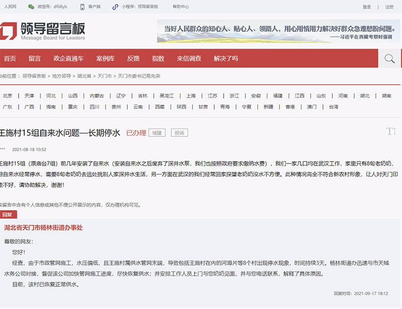 9月17日,湖北省天門市楊林街道辦事處回復(fù)稱:“經(jīng)查,由于市政管網(wǎng)施工,水壓偏低,且王施村屬供水管網(wǎng)末端,導(dǎo)致包括王施村在內(nèi)的河埠片等8個(gè)村出現(xiàn)停水現(xiàn)象,時(shí)間持續(xù)3天。楊林街道辦迅速與市天城水務(wù)公司對(duì)接,督促該公司加快管網(wǎng)施工進(jìn)度,盡快恢復(fù)供水。目前,該村已恢復(fù)正常供水。 ”
