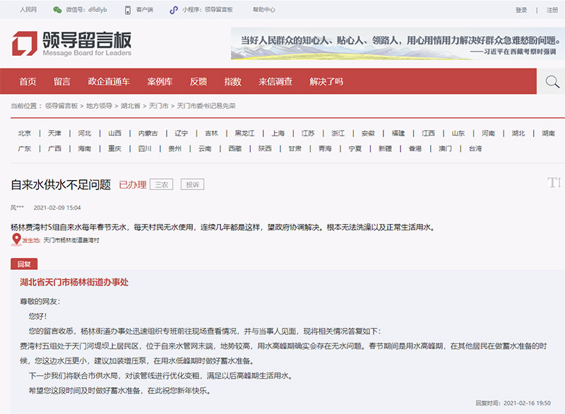小編發(fā)現(xiàn),2月9日,就有網(wǎng)友留言稱:“楊林費(fèi)灣村5組自來(lái)水每年春節(jié)無(wú)水,每天村民無(wú)水使用,連續(xù)幾年都是這樣!睂(duì)此條留言,湖北省天門市楊林街道辦事處回復(fù)稱:“費(fèi)灣村五組處于天門河堤壩上居民區(qū),位于自來(lái)水管網(wǎng)末端,地勢(shì)較高,用水高峰期確實(shí)會(huì)存在無(wú)水問題。春節(jié)期間是用水高峰期,在其他居民做蓄水準(zhǔn)備的時(shí)候,您這邊水壓更小,建議加裝增壓泵,在用水低峰期時(shí)做好蓄水準(zhǔn)備。下一步將聯(lián)合市供水局,對(duì)該管線進(jìn)行優(yōu)化變粗,滿足以后高峰期生活用水!