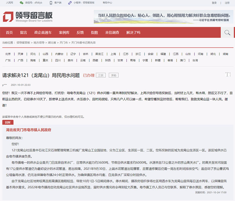 10月24日,湖北省天門市皂市鎮(zhèn)人民政府回復(fù)稱:“皂市鎮(zhèn)唯一的供水企業(yè)是天門白龍泉自來(lái)水廠,日常供水能力約3600噸,節(jié)假日供水需求約6000噸。水源來(lái)自72公里之外的京山高關(guān)水廠。高關(guān)至宋河段面有17公里供水管道仍為最初設(shè)計(jì)的水泥管道,易出故障。雖啟動(dòng)了京山曹武雞公塔備用水源,仍無(wú)法保障皂市鎮(zhèn)24小時(shí)正常供水。2022年皂市鎮(zhèn)將啟動(dòng)龍尾山社區(qū)供水設(shè)施改造,屆時(shí)供水情況將會(huì)得到較大改善!