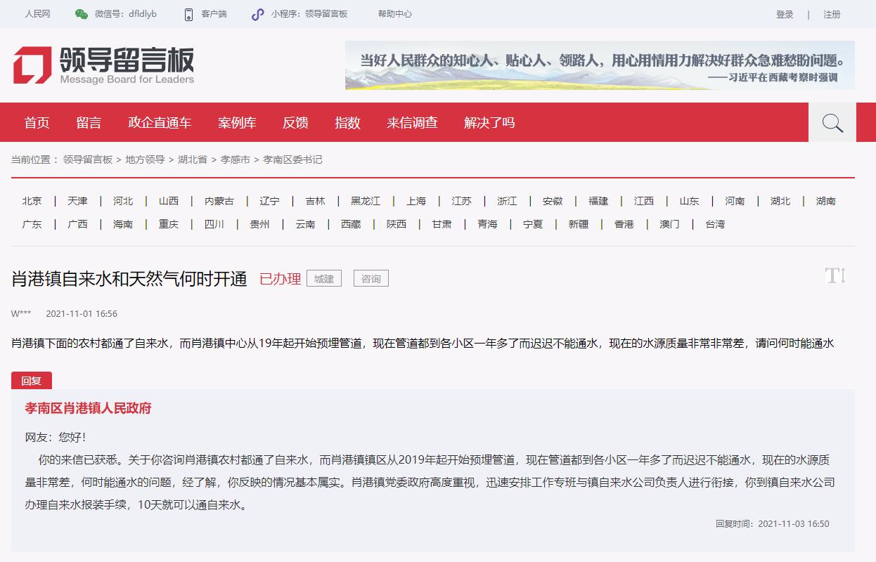 針對(duì)上述留言,11月3日,湖北省孝感市孝南區(qū)肖港鎮(zhèn)人民政府回復(fù),已安排工作專班與鎮(zhèn)自來(lái)水公司負(fù)責(zé)人進(jìn)行銜接,網(wǎng)友可到鎮(zhèn)自來(lái)水公司辦理自來(lái)水報(bào)裝手續(xù),10天就可以通自來(lái)水。
