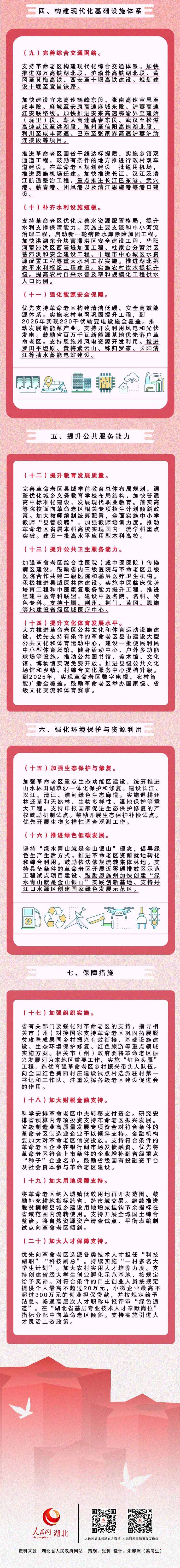 《實施意見》從基礎(chǔ)設(shè)施建設(shè)、鞏固拓展脫貧攻堅成果、生態(tài)環(huán)境保護(hù)修復(fù)、發(fā)展紅色旅游、保護(hù)和傳承紅色文化、培育壯大特色產(chǎn)業(yè)、提升公共服務(wù)能力等七方面,細(xì)化出20條具體措施,指導(dǎo)并支持革命老區(qū)振興發(fā)展。