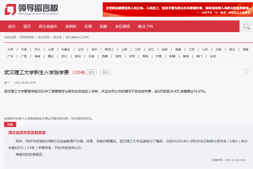 面對學生投訴,湖北省政府政務督查室回復表示,網(wǎng)友反映的問題已交由湖北省教育廳辦理。經(jīng)查,反映問題屬實。武漢理工大學迅速進行了整改,決定對2021年入學的非全日制碩士研究生(MBA)執(zhí)行總額6萬元(2.5年)的學費標準,并在學校官網(wǎng)公示。對于明年部分專業(yè)學費上漲,學校已提前進行了公示,公布了新標準。