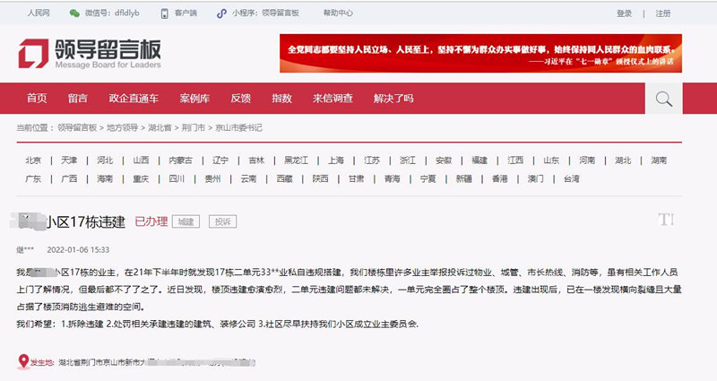 人民網(wǎng)武漢1月12日電 (關喜艷)1月6日,一網(wǎng)友在人民網(wǎng)“領導留言板”湖北京山板塊下留言,反映其小區(qū)違建問題,請求解決。對此,官方回應:已要求業(yè)主盡快拆除,將繼續(xù)對違建問題進行跟進,確保對違建行為露頭就打。