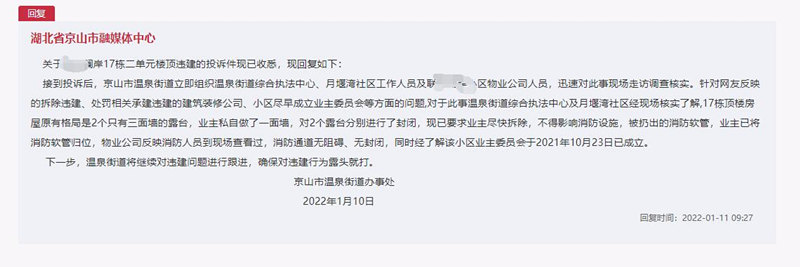 1月11日,湖北省京山市溫泉街道辦事處回應稱,在接到網(wǎng)友投訴后,已立即組織街道綜合執(zhí)法中心、月堰灣社區(qū)工作人員及被投訴小區(qū)物業(yè)公司人員,迅速對此事現(xiàn)場走訪調(diào)查核實。經(jīng)現(xiàn)場核實了解,該小區(qū)17棟頂樓房屋原有格局是2個只有三面墻的露臺,業(yè)主私自做了一面墻,對2個露臺分別進行了封閉,現(xiàn)已要求業(yè)主盡快拆除,不得影響消防設施。被扔出的消防軟管,業(yè)主已將其歸位。物業(yè)公司反映消防人員已到現(xiàn)場查看,消防通道無阻礙、無封閉。