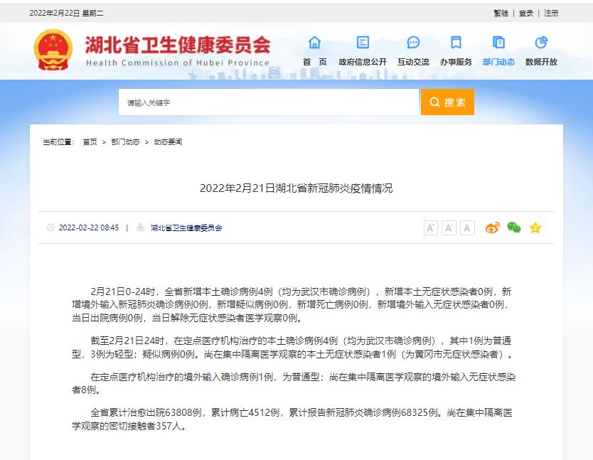 人民網(wǎng)武漢2月22日電 據(jù)湖北省衛(wèi)健委消息,2月21日0-24時(shí),全省新增本土確診病例4例(均為武漢市確診病例),新增本土無(wú)癥狀感染者0例,新增境外輸入新冠肺炎確診病例0例,新增疑似病例0例,新增死亡病例0例,新增境外輸入無(wú)癥狀感染者0例,當(dāng)日出院病例0例,當(dāng)日解除無(wú)癥狀感染者醫(yī)學(xué)觀察0例。