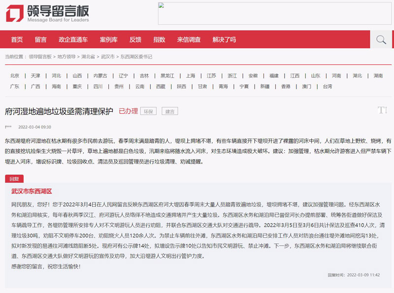 人民網(wǎng)武漢3月10日電 (周雯)陽春三月,正是踏青的好時節(jié)。武漢市東西湖區(qū)境內(nèi)的府河濕地公園正值枯水期,裸露的河床吸引很多市民前往踏青。“春季周末大量人員踏青致遍地垃圾,堤壩擁堵不堪,建議加強(qiáng)管理。”3月4日,有群眾在人民網(wǎng)“領(lǐng)導(dǎo)留言板”留言表示。對此,武漢市東西湖區(qū)立馬進(jìn)行了部署,并對該群眾的建議一一進(jìn)行了安排。