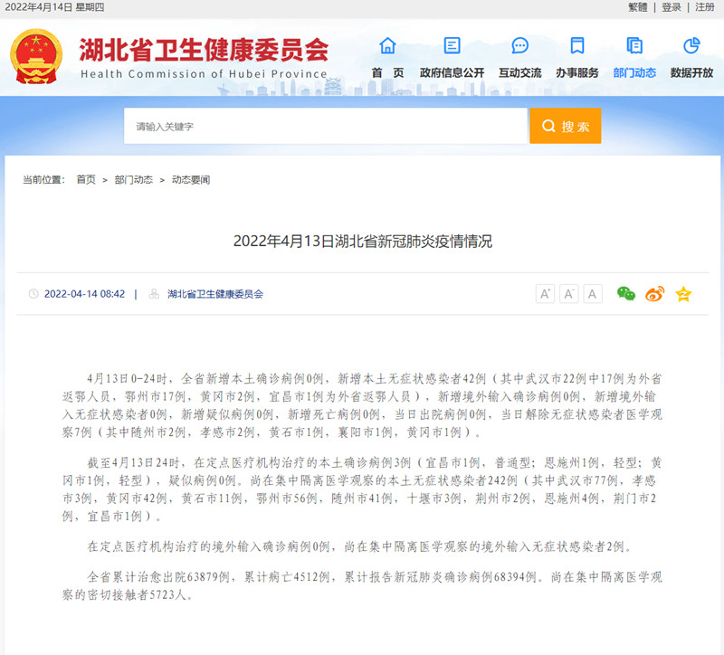 4月13日湖北新增本土無(wú)癥狀感染者42例