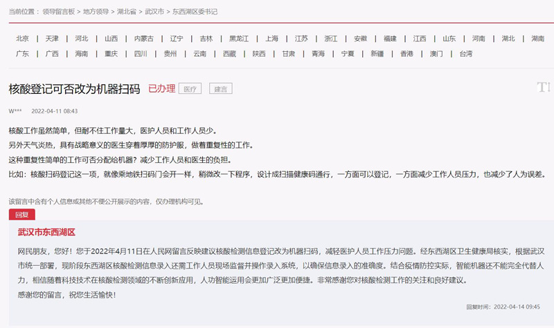 人民網(wǎng)武漢4月19日電 (周雯)“核酸檢測工作任務(wù)重、壓力大,核酸掃碼登記這項工作,能否設(shè)計一款機器來負責掃碼,減少工作人員壓力!苯眨芯W(wǎng)友在人民網(wǎng)“領(lǐng)導留言板”上留言建議。對此,湖北省武漢市東西湖區(qū)對此進行了回復,并表示“非常感謝您對核酸檢測工作的關(guān)注和良好建議!
