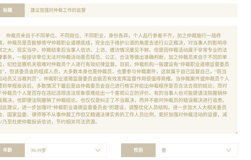 網(wǎng)友建議,進(jìn)一步加強(qiáng)對“仲裁職業(yè)道德監(jiān)督委員會”的建設(shè),調(diào)整優(yōu)化人員結(jié)構(gòu),進(jìn)一步加大人大相關(guān)委員會、國家監(jiān)委、律師等不從事仲裁工作但又精通法律實(shí)務(wù)的工作人員比例,更好加強(qiáng)對仲裁活動的監(jiān)督,減少乃至杜絕仲裁投訴信訪,節(jié)約相關(guān)司法資源。