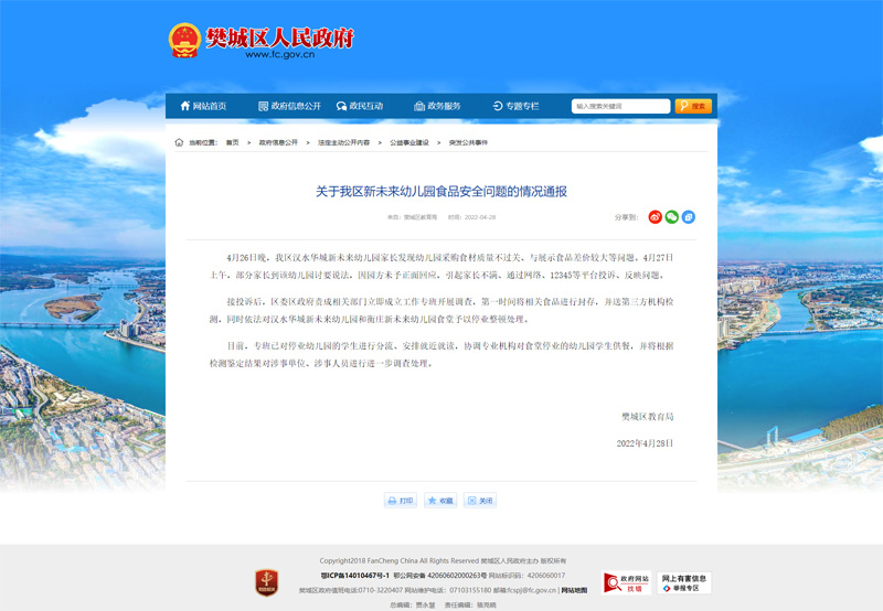 樊城區(qū)教育局發(fā)布《關(guān)于新未來(lái)幼兒園食品安全問(wèn)題的情況通報(bào)》。