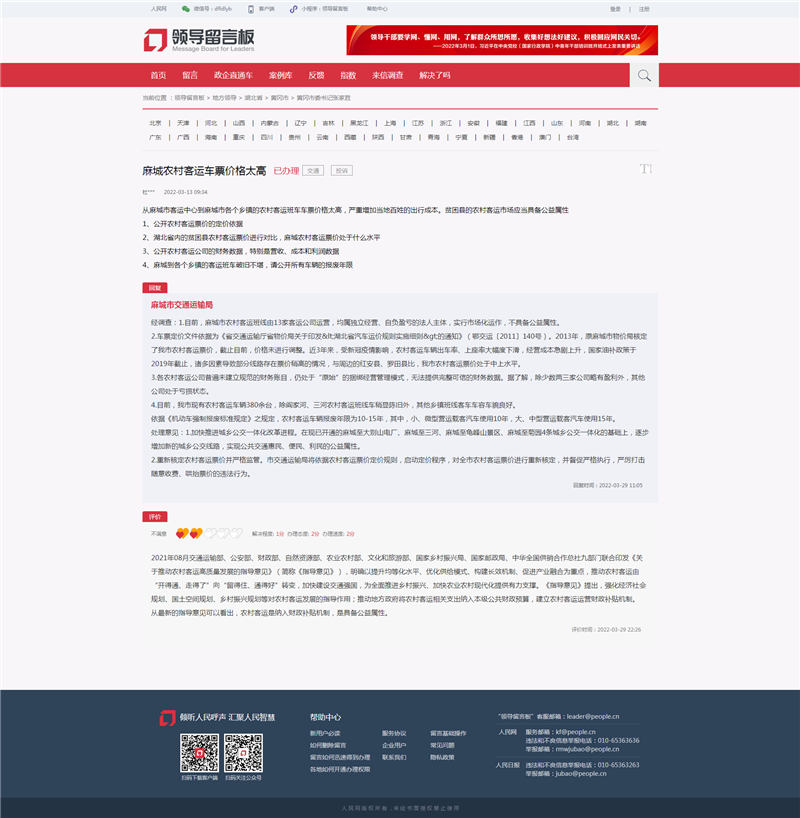 人民網(wǎng)武漢5月31日電(郭婷婷)“從市區(qū)客運中心到各個鄉(xiāng)鎮(zhèn)的農(nóng)村客運班車車票價格太高,增加了當?shù)匕傩盏某鲂谐杀!比涨,一網(wǎng)友在人民網(wǎng)“領導留言板”向黃岡市委書記建言,認為農(nóng)村客運市場應具備公益性,票價過高,增加村民出行成本。對此,麻城市交通運輸局回復稱,將加快推進城鄉(xiāng)公交一體化改革進程,重新核定農(nóng)村客運票價并嚴格監(jiān)管。