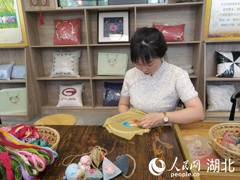 2012年,謝蓉牽頭組建宜昌繡女工藝品專業(yè)合作社,之后又成立宜昌沁邑民俗文化有限公司,用手繡+艾草+棉麻的生態(tài)特色文化理念,創(chuàng)立“三峽·艾”特色品牌,傳承峽江繡藝“牽花繡”、發(fā)展手工刺繡產(chǎn)品。