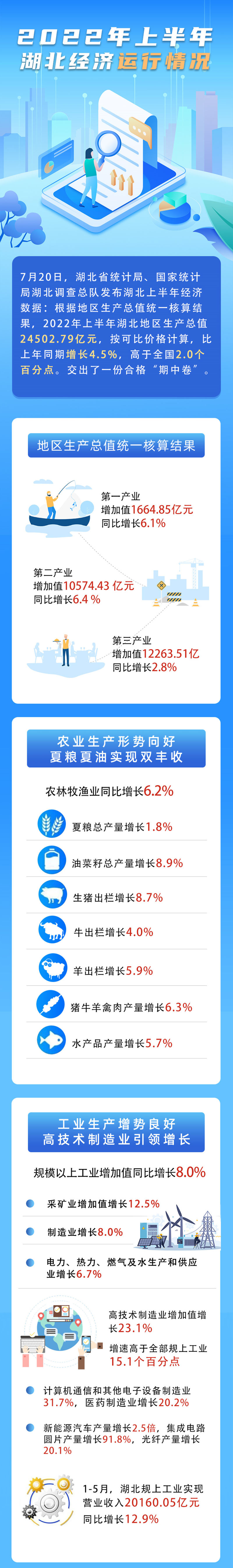 近期,全國多個(gè)省份也陸續(xù)公布上半年經(jīng)濟(jì)數(shù)據(jù)。7月20日,湖北省統(tǒng)計(jì)局、國家統(tǒng)計(jì)局湖北調(diào)查總隊(duì)發(fā)布該省上半年經(jīng)濟(jì)數(shù)據(jù):根據(jù)地區(qū)生產(chǎn)總值統(tǒng)一核算結(jié)果,2022年上半年全省地區(qū)生產(chǎn)總值24502.79億元,按可比價(jià)格計(jì)算,比上年同期增長(zhǎng)4.5%,高于全國2.0個(gè)百分點(diǎn)。從全國范圍來看,湖北4.5%的GDP增速表現(xiàn)亮眼,穩(wěn)居全國第一梯隊(duì),交出了一份來之不易的半年經(jīng)濟(jì)答卷。