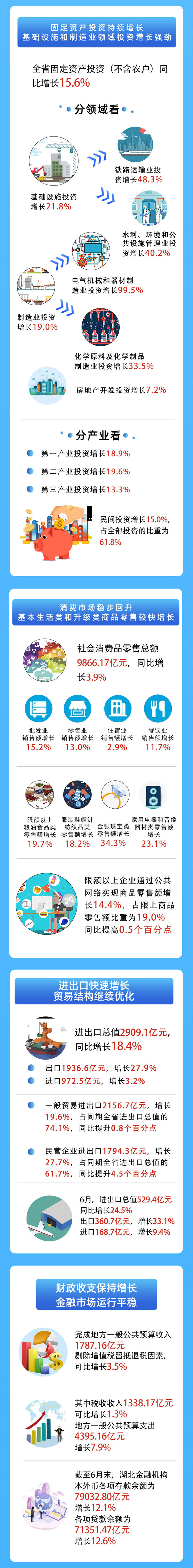 上半年,湖北省GDP、農(nóng)林牧漁業(yè)增加值、工業(yè)、投資、進(jìn)出口分別較上年同期增長(zhǎng)4.5%、6.2%、8.0%、15.6%、18.4%。社零額穩(wěn)步回升,增長(zhǎng)3.9%。1-5月全省規(guī)上服務(wù)業(yè)營業(yè)收入增長(zhǎng)11.1%。主要指標(biāo)增速均高于全國平均水平,增速居全國第一方陣。