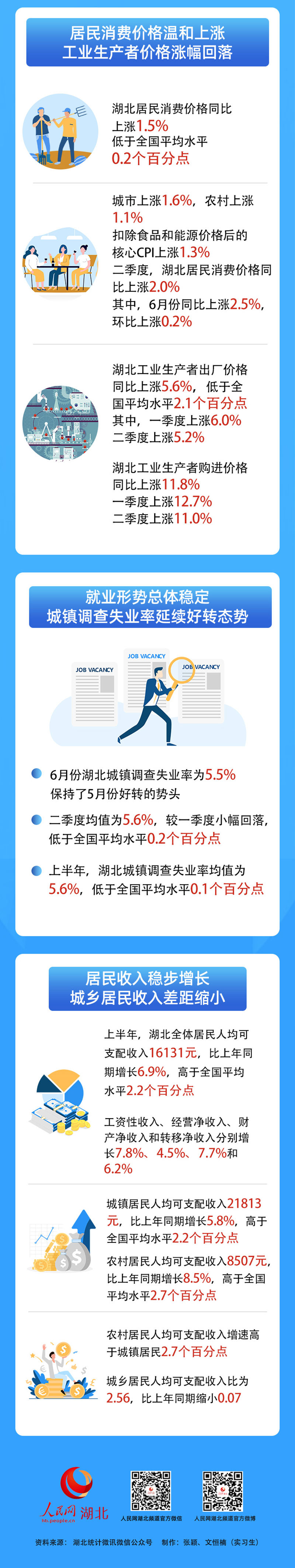 上半年,湖北農(nóng)產(chǎn)品供給充裕,夏糧夏油實(shí)現(xiàn)雙豐收,產(chǎn)量較上年同期分別增長(zhǎng)1.8%和8.9%。城鎮(zhèn)居民人均可支配收入21813元,增長(zhǎng)5.8%;農(nóng)村居民人均可支配收入8507元,增長(zhǎng)8.5%,均保持穩(wěn)步增長(zhǎng)。
