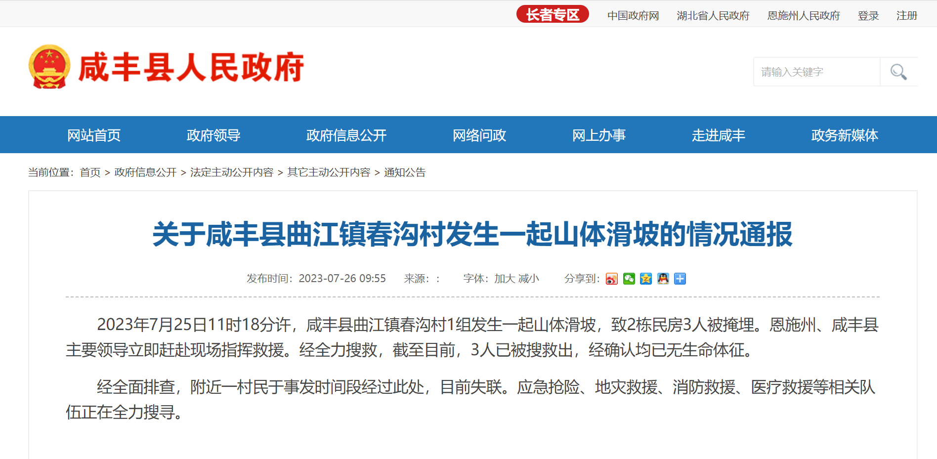經(jīng)過持續(xù)搜尋,截至7月26日11時許,3名被掩埋人員被搜救出,經(jīng)確認(rèn)均已無生命體征。失聯(lián)村民在咸豐縣曲江鎮(zhèn)春溝村1組山體滑坡現(xiàn)場搜救出,經(jīng)確認(rèn)已無生命體征。目前,善后處置工作正在有序進(jìn)行。