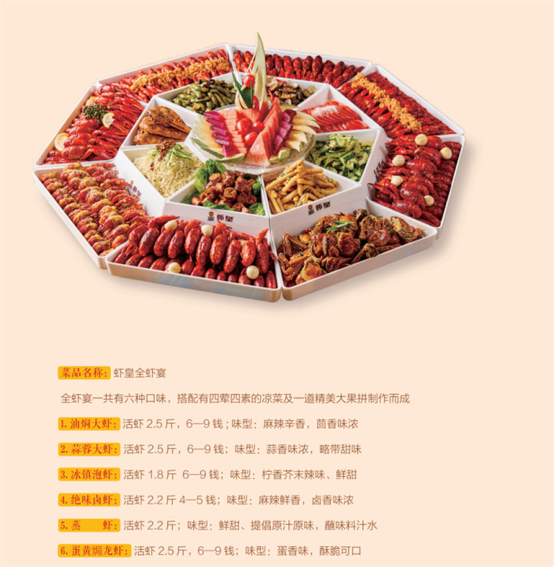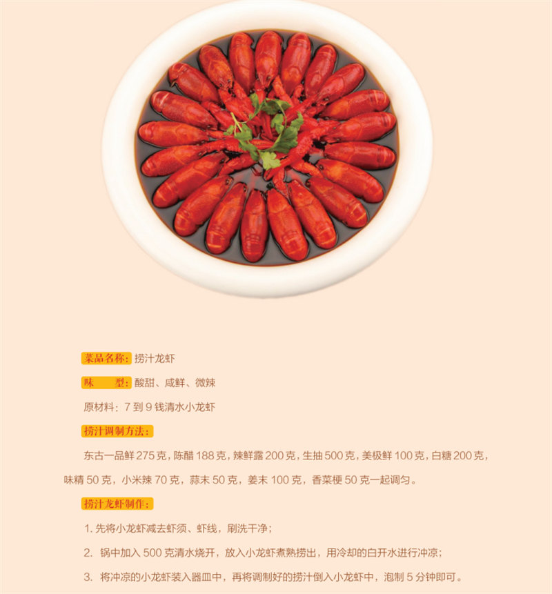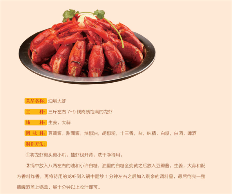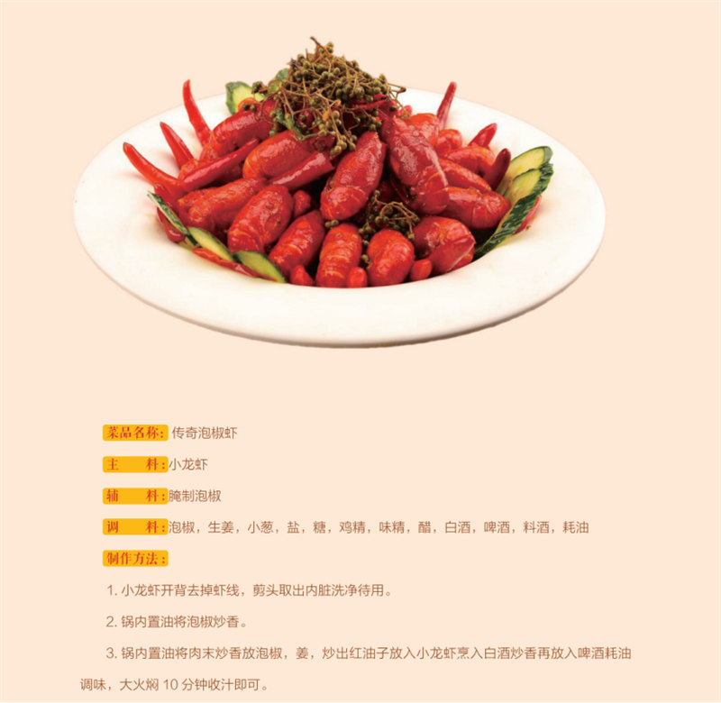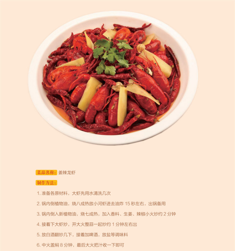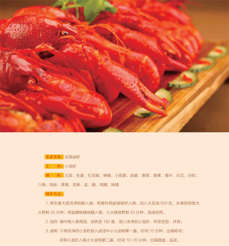 潛江龍蝦特色美食起源于“潛江油燜大蝦”。潛江油燜大蝦精選潛江淡水小龍蝦為原料,佐以桂皮、八角、小苗香、砂仁、白芷、香葉、白蔑等多種香料和中藥材,以潛江特有的“油燜”烹飪方法制作。