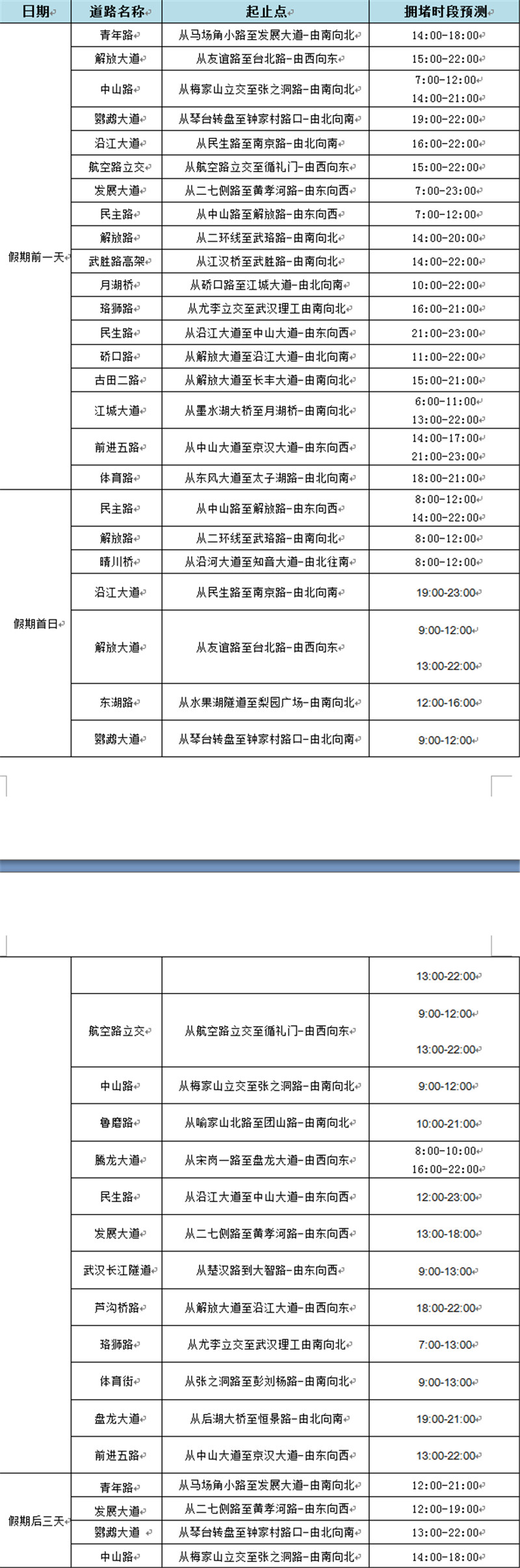 預(yù)計江漢路、武廣、萬象城、龍湖天街、夢時代等商圈,周邊道路京漢大道、解放大道、建設(shè)大道、白沙三路、武珞路等將在10時至19時出現(xiàn)出行集中的情況。