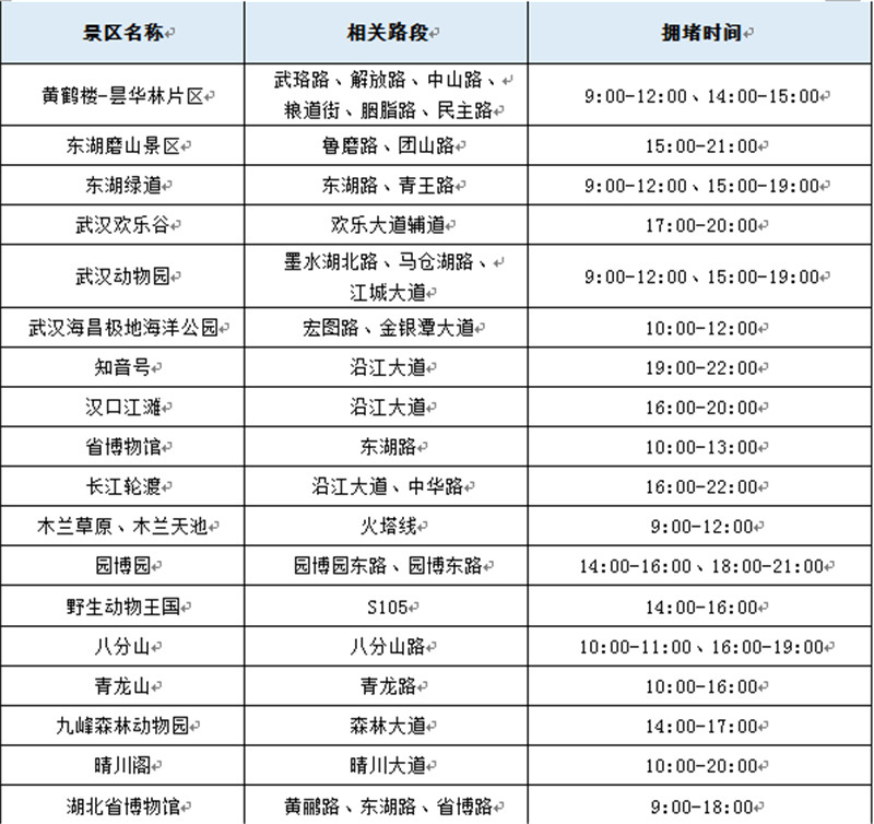 黃鶴樓公園:預(yù)計節(jié)日期間人流量、車流量劇增,周邊的武珞路、解放路、民主路等將在上午9時至12時,下午15時至22時出現(xiàn)明顯擁堵狀態(tài)。