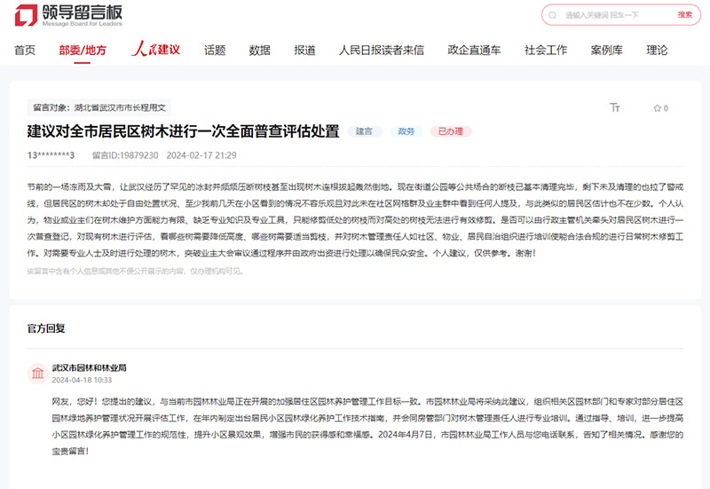 人民網(wǎng)武漢4月19日電 (記者周雯)“今年2月,武漢遭遇了罕見的凍雨等極端災害天氣,不少小區(qū)里樹枝被壓斷,甚至出現(xiàn)樹木被連根拔起等情況,十分危險?!苯?,有網(wǎng)友在人民網(wǎng)“領導留言板”留言建議,希望相關職能部門能牽頭對居民區(qū)樹木進行一次普查登記,加強對綠化管理責任人員的培訓,提高小區(qū)綠化養(yǎng)護管理工作的規(guī)范性。對此,武漢市園林和林業(yè)局回復,該建議與正在開展的加強居住區(qū)園林養(yǎng)護管理工作目標一致,采納此建議。