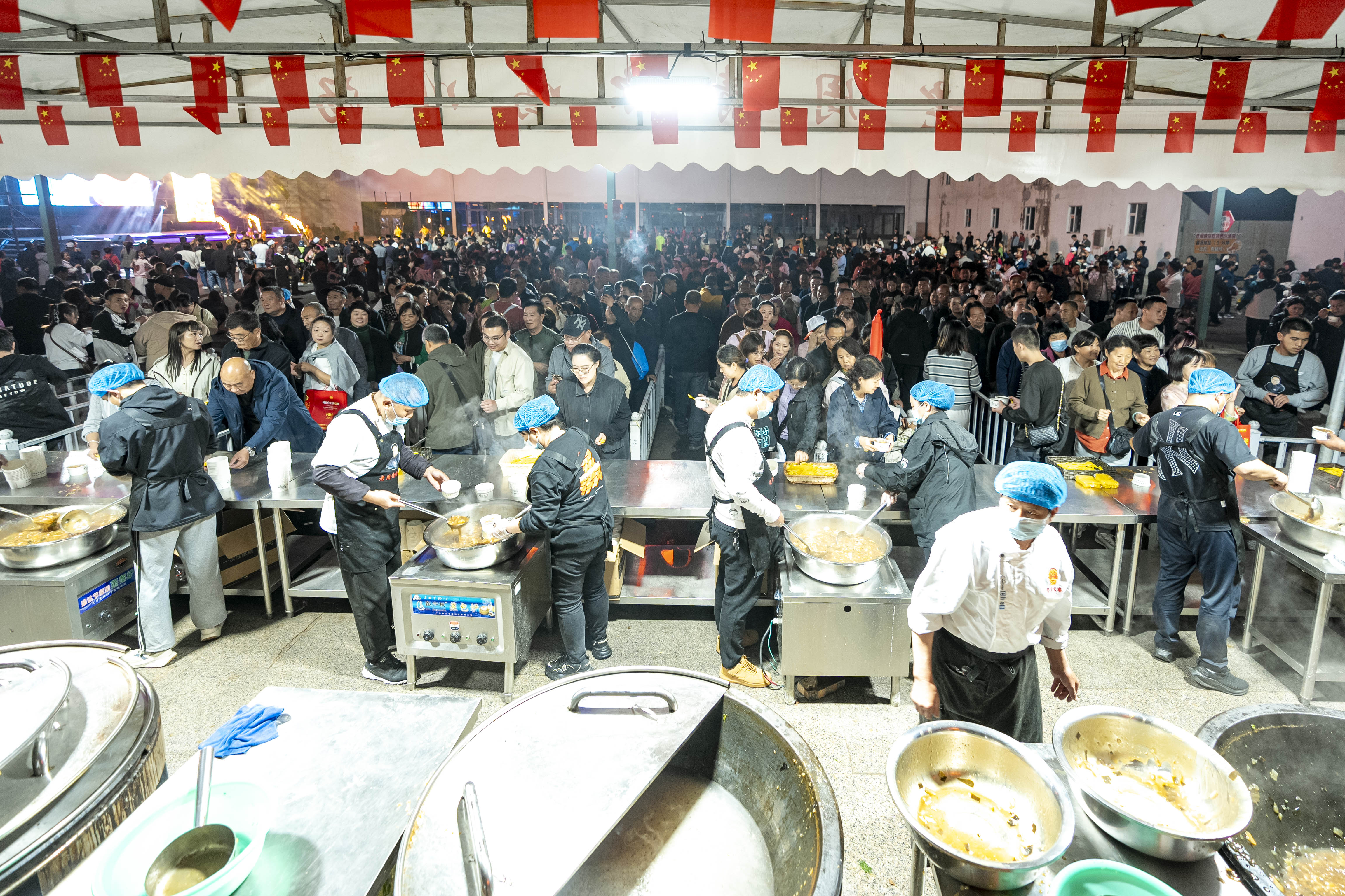演出結(jié)束后,游客們排隊領取熱氣騰騰的晉城特色美食川湯。