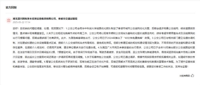 收到建議后,湖北澴川國(guó)有資本投資運(yùn)營(yíng)集團(tuán)有限公司和孝感市交通運(yùn)輸局對(duì)網(wǎng)民建議一一回應(yīng)。