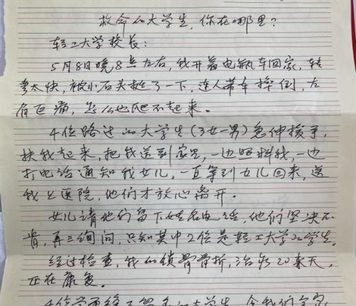 “救命的大學生,你在哪里?”6月19日,一封飽含深情的手寫“尋人啟事”寄到了武漢輕工大學校長董仕節(jié)手中。文中,家住武漢市東西湖區(qū)的陳應明老人懇請校長幫忙找到救助自己卻不留姓名的武漢輕工大學學生。