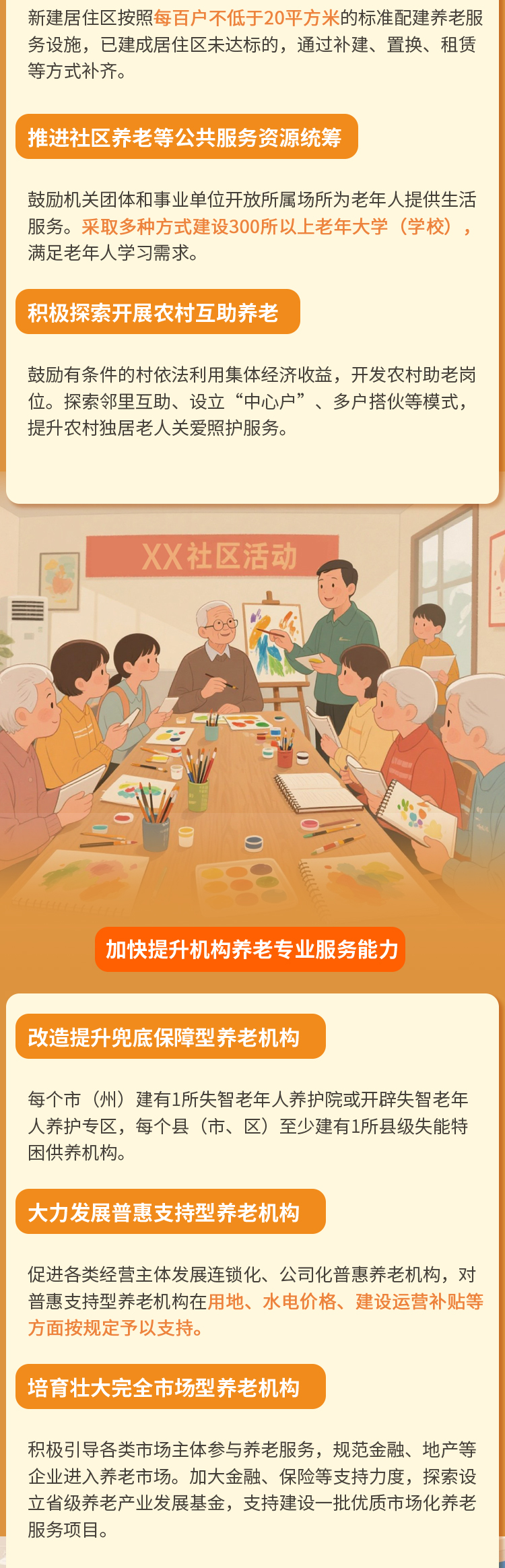 近期,湖北省政府印發(fā)《湖北省加快建設(shè)多元化養(yǎng)老服務(wù)體系實施方案》,從全面提升居家養(yǎng)老服務(wù)水平、持續(xù)優(yōu)化社區(qū)養(yǎng)老服務(wù)供給、加快提升機構(gòu)養(yǎng)老專業(yè)服務(wù)能力、促進醫(yī)療衛(wèi)生與養(yǎng)老服務(wù)深度融合、積極培育發(fā)展養(yǎng)老產(chǎn)業(yè)5個方面提出18條措施。力爭到2027年湖北縣(市、區(qū))、鄉(xiāng)鎮(zhèn)(街道)、村(社區(qū))三級養(yǎng)老服務(wù)網(wǎng)絡(luò)基本建成,養(yǎng)老服務(wù)供給不斷擴大,湖北省養(yǎng)老床位達到54萬張以上,社會化養(yǎng)老機構(gòu)達到1000家以上。一圖了解!