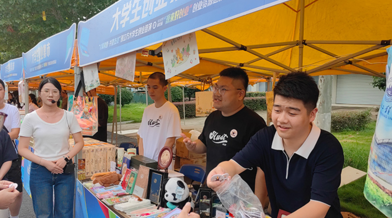 創(chuàng)意集市上創(chuàng)業(yè)大學(xué)生正在展示設(shè)計(jì)的文創(chuàng)產(chǎn)品。